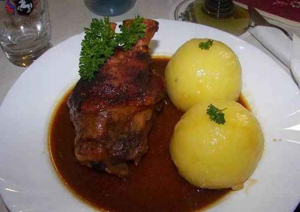 バリエーション: 茹でたアイスバインもありますが、ローストしたものの方が好まれます。その美しい黄金色の色合いは、茹でたアイスバインが持つ淡白で食欲をそそらない見た目とは対照的です。ドイツでこの料理を食べ損ねるのは、ニューヨークを訪れて自由の女神像を見ないのと同じで、旅行者がしてはいけない食の落とし穴です。