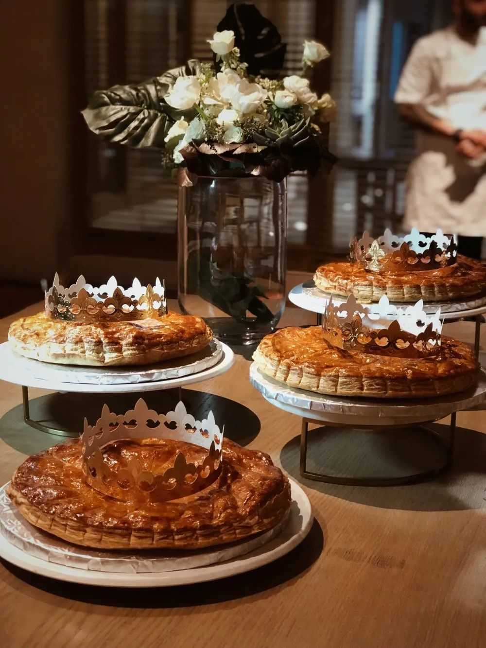 お祝いには欠かせないラ・ガレット・デ・ロワフランジパーヌ(アーモンドクリーム)を詰めたサクサクのペストリー。中には陶器の置物などの小物が隠されていることが多い。中世の公現祭にまで遡るこの伝統では、この小物を見つけた人は「王」または「女王」の称号を与えられ、その年の幸運がもたらされると考えられている。シャンパンと一緒に食べると、子供も大人も黄金色の生地を熱心に切り分け、楽しいひとときを演出する。